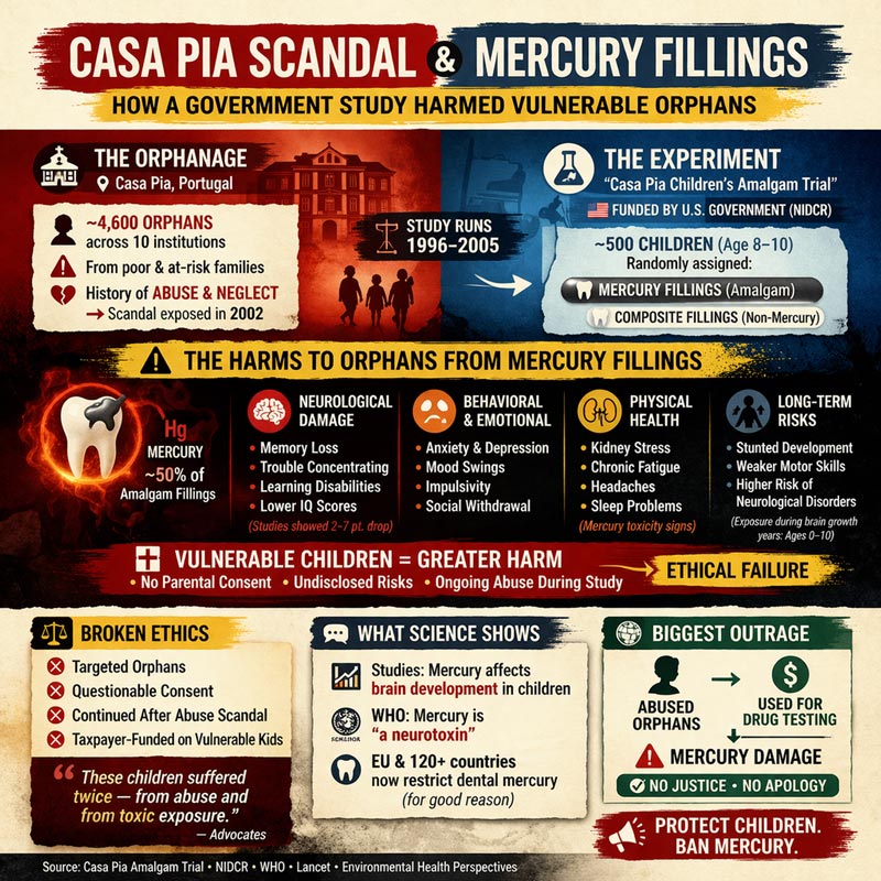 The trial enrolled approximately 507 children, many of them wards of the state residing in the Casa Pia institutions in Lisbon, Portugal. These children—aged 8–12 at baseline—received mercury-containing dental amalgam fillings during critical periods of neurological and physiological development. At the same time, they endured an environment later documented for widespread sexual and physical abuse.
