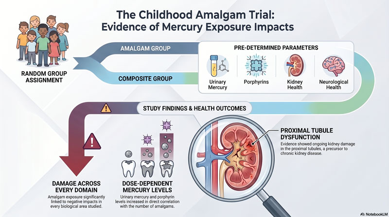 The original trial randomized ~507 children (aged 8–12 at baseline) to amalgam or composite restorations and followed them for up to 7 years. Primary conclusions emphasized no significant average group differences in neurobehavioral outcomes, but secondary and re-analyses highlighted signals in subgroups, dose-response relationships, renal biomarkers, and genetic susceptibility.