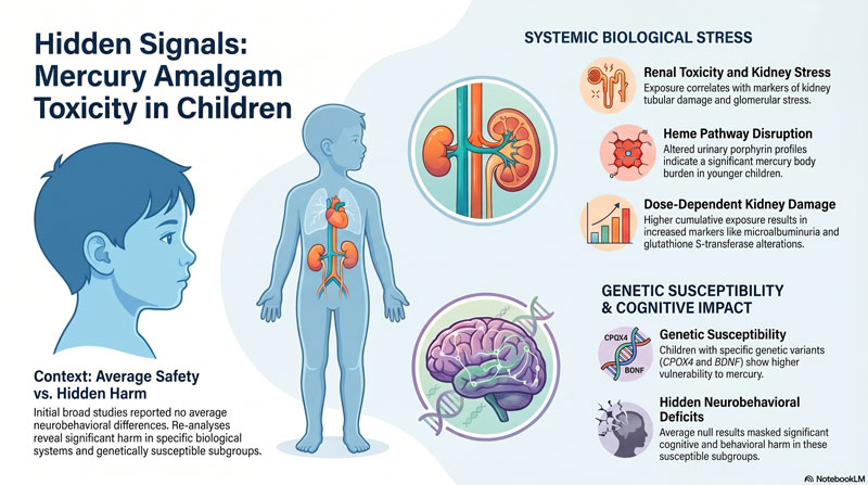 - Dose-dependent kidney effects: Re-analyses by Geier et al. (2012–2013) found statistically significant associations between cumulative amalgam exposure and markers of proximal tubular damage, including microalbuminuria and glutathione S-transferase alterations.